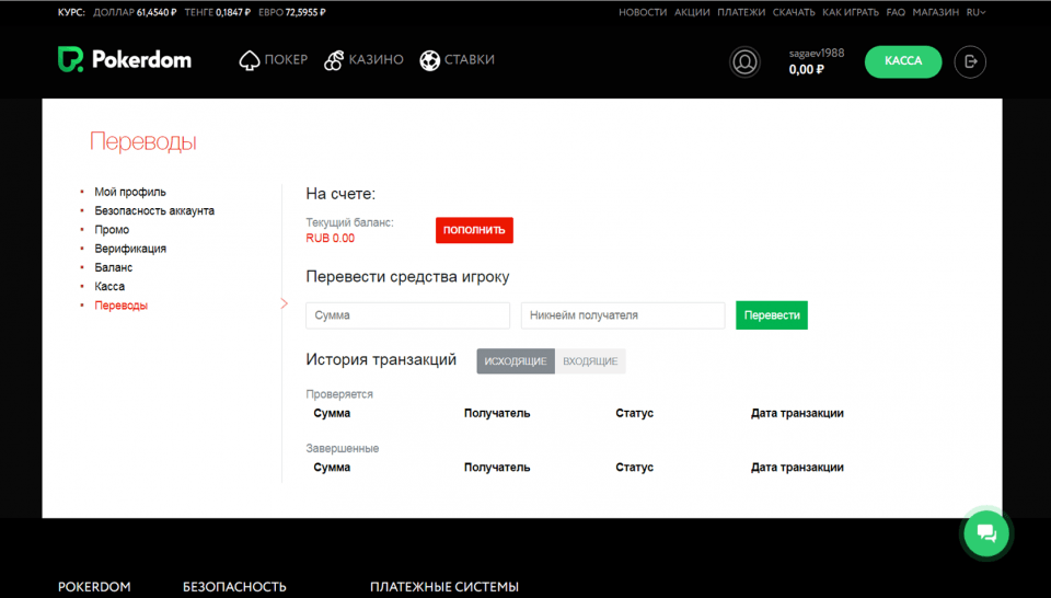 - Переводы. В ПокерДом действует услуга денежных переводов между клиентами комнаты. Все действия можно осуществить, посетив данный блок. Для отправки перевода следует указать ник получателя и сумму. Средства, полученные переводом позволяется использовать только для ставок, кэш-ауту они не подлежат.