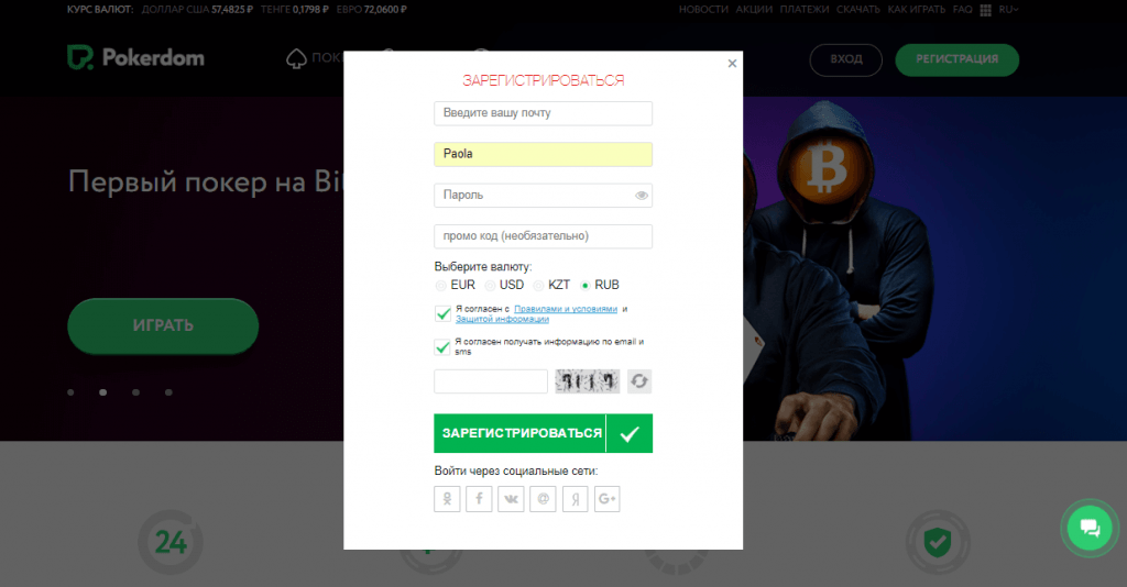 Форма также предлагает вам выбрать валюту: рубли, тенге, евро и доллары. Вы можете выбрать любую желаемую валюту, но, конечно же, рекомендуется выбирать рубли. Именно в рублях совершается большинство ставок за кэш-столами, а также проводится большинство турниров.